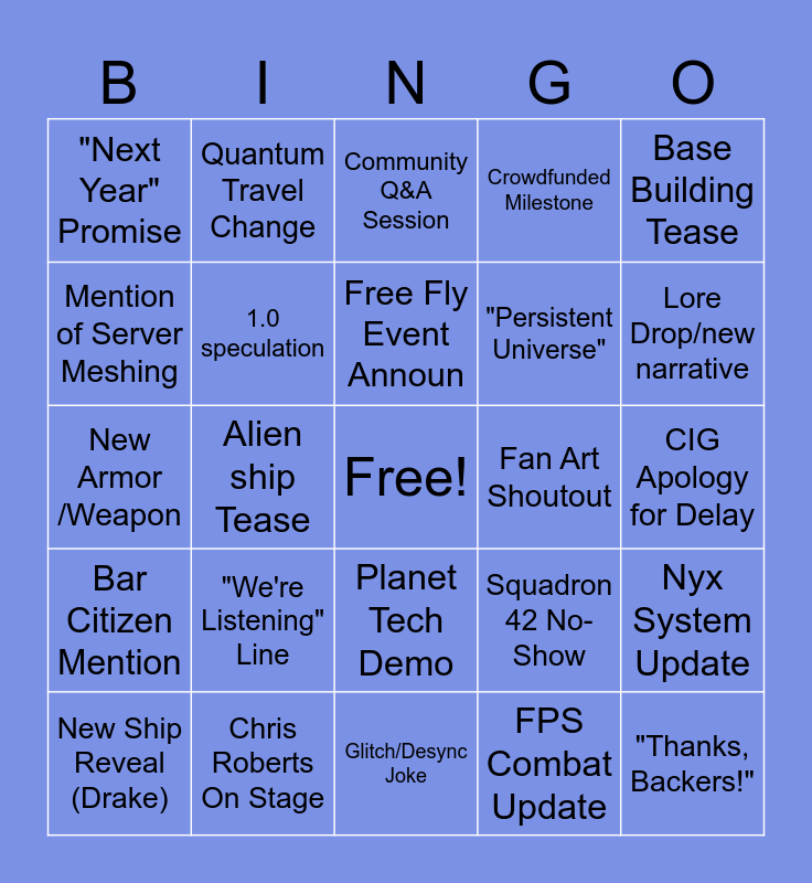 This bingo card has a free space and 24 words: "We're Listening" Line, Chris Roberts On Stage, Free Fly Event Announ, New Ship Reveal (Drake), Base Building Tease, "Next Year" Promise, Mention of Server Meshing, Quantum Travel Change, Fan Art Shoutout, Planet Tech Demo, "Persistent Universe", New Armor /Weapon, Squadron 42 No-Show, Nyx System Update, 1.0 speculation, FPS Combat Update, CIG Apology for Delay, Community Q&A Session, Lore Drop/new narrative, Alien ship Tease, "Thanks, Backers!", Bar Citizen Mention, Crowdfunded Milestone and Glitch/Desync Joke.
