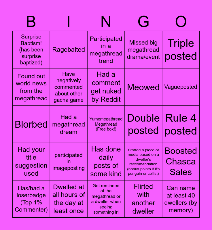 This bingo card has a free space and 24 words: participated in imageposting, Dwelled at all hours of the day at least once, Had a comment get nuked by Reddit, Has/had a loserbadge (Top 1% Commenter), Triple posted, Surprise Baptism! (has been surprise baptized), Found out world news from the megathread, Ragebaited, Double posted, Has done daily posts of some kind, Meowed, Blorbed, Started a piece of media based on a dweller's reccomendation (bonus points if it's penguin or cellist), Boosted Chasca Sales, Have negatively commented about other gacha game, Flirted with another dweller, Rule 4 posted, Participated in a megathread trend, Vagueposted, Had a megathread dream, Can name at least 40 dwellers (by memory), Had your title suggestion used, Missed big megathread drama/event and Got reminded of the megathread or a dweller when seeing something irl.