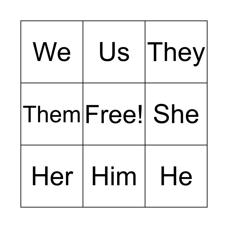 This bingo card has a free space and 8 words: She, They, Us, Her, We, He, Them and Him.