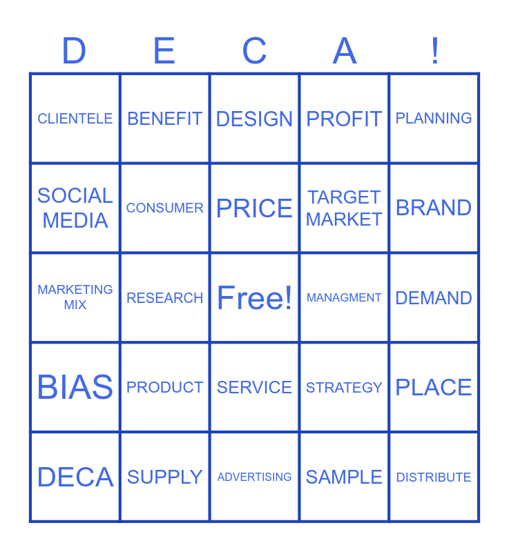 This bingo card has a free space and 29 words: DECA, SLOGAN, RESEARCH, SALES, CLIENTELE, DESIGN, CONSUMER, PRODUCT, MANAGMENT, SUPPLY, DEMAND, DISTRIBUTE, ADVERTISING, SAMPLE, BRAND, REPUTATION, SERVICE, BIAS, PLANNING, MARKETING MIX, STRATEGY, MARKET SHARE, TARGET MARKET, SOCIAL MEDIA, PROFIT, BENEFIT, PLACE, PRICE and PROMOTION.