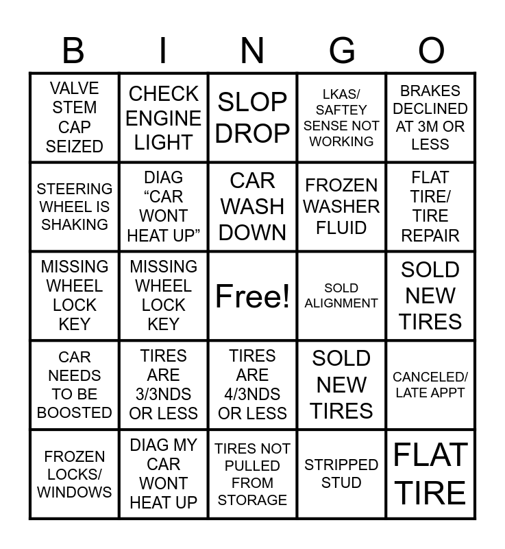 This bingo card has a free space and 48 words: SOLD NEW BATTERY, FLAT TIRE, WALK IN TIRE CHANGE, TIRES NOT PULLED FROM STORAGE, TIRES ARE 3/3NDS OR LESS, CAR WONT START, CHECK ENGINE LIGHT, TIRE LIGHT IS ON, STEERING WHEEL IS SHAKING, DO I HAVE A BLOCK HEATER?, DIAG “CAR WONT HEAT UP”, LKAS/ SAFTEY SENSE NOT WORKING, CANCELED/ LATE APPT, SOLD NEW TIRES, TIRE TOP- UP IN DRIVE THRU, TOWED IN, CAR WASH DOWN, SOLD ALIGNMENT, GUEST IN FLIP FLOPS & SHORTS, BRAKES DECLINED AT 3M OR LESS, MISSING WHEEL LOCK KEY, STRIPPED STUD, VALVE STEM CAP SEIZED, FROZEN WASHER FLUID, SOLD DEAD BATTERY, FLAT TIRE/ TIRE REPAIR, FROZEN LOCKS/ WINDOWS, TIRES NOT PULLED FROM STORAGE, TIRES ARE 4/3NDS OR LESS, CAR NEEDS TO BE BOOSTED, CHECK ENGINE LIGHT ON, TIRE LIGHT IS ON, STEERING WHEEL IS SHAKING, DO I HAVE A BLOCK HEATER?, DIAG MY CAR WONT HEAT UP, LKAS/ SAFTEY SENSE NOT WORKING, BRAKES DECLINED AT 3M OR LESS, SOLD NEW TIRES, TIRE TOP- UP, TOWED IN, DUST OFF CAR OR SCRAPE W/S, SOLD ALIGNMENT, SLOP DROP, BALD TIRE TEST DRIVE, MISSING WHEEL LOCK KEY, STRIPPED STUD, VALVE STEM CAPS SEIZED and FROZEN WASHER FLUID.