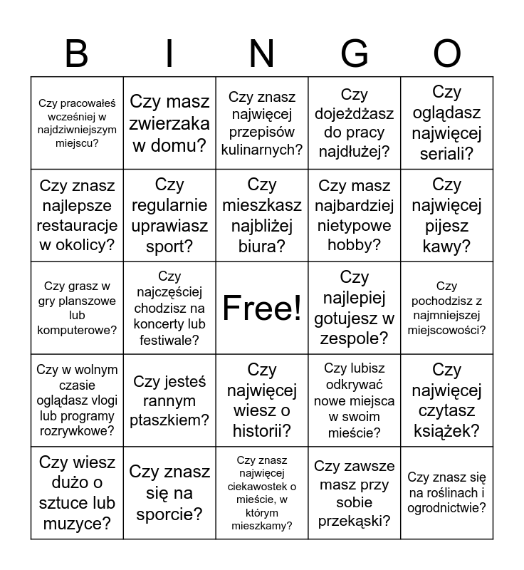 This bingo card has a free space and 24 words: Czy jesteś rannym ptaszkiem?, Czy znasz się na sporcie?, Czy mieszkasz najbliżej biura?, Czy wiesz dużo o sztuce lub muzyce?, Czy oglądasz najwięcej seriali?, Czy pracowałeś wcześniej w najdziwniejszym miejscu?, Czy znasz najlepsze restauracje w okolicy?, Czy masz zwierzaka w domu?, Czy najlepiej gotujesz w zespole?, Czy najwięcej wiesz o historii?, Czy masz najbardziej nietypowe hobby?, Czy grasz w gry planszowe lub komputerowe?, Czy lubisz odkrywać nowe miejsca w swoim mieście?, Czy najwięcej czytasz książek?, Czy regularnie uprawiasz sport?, Czy zawsze masz przy sobie przekąski?, Czy pochodzisz z najmniejszej miejscowości?, Czy znasz najwięcej przepisów kulinarnych?, Czy najwięcej pijesz kawy?, Czy najczęściej chodzisz na koncerty lub festiwale?, Czy znasz się na roślinach i ogrodnictwie?, Czy w wolnym czasie oglądasz vlogi lub programy rozrywkowe?, Czy dojeżdżasz do pracy najdłużej? and Czy znasz najwięcej ciekawostek o mieście, w którym mieszkamy?.