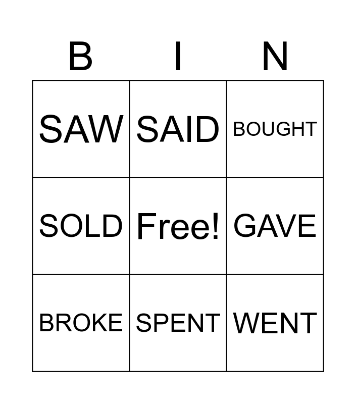 This bingo card has a free space and 20 words: SENT, PAID, BOUGHT, DID, HAD, WENT, WAS/WERE, SAW, FORGOT, SAID, MADE, TOOK, GAVE, WROTE, BROKE, MET, SPENT, SOLD, CHOSE and KNEW.