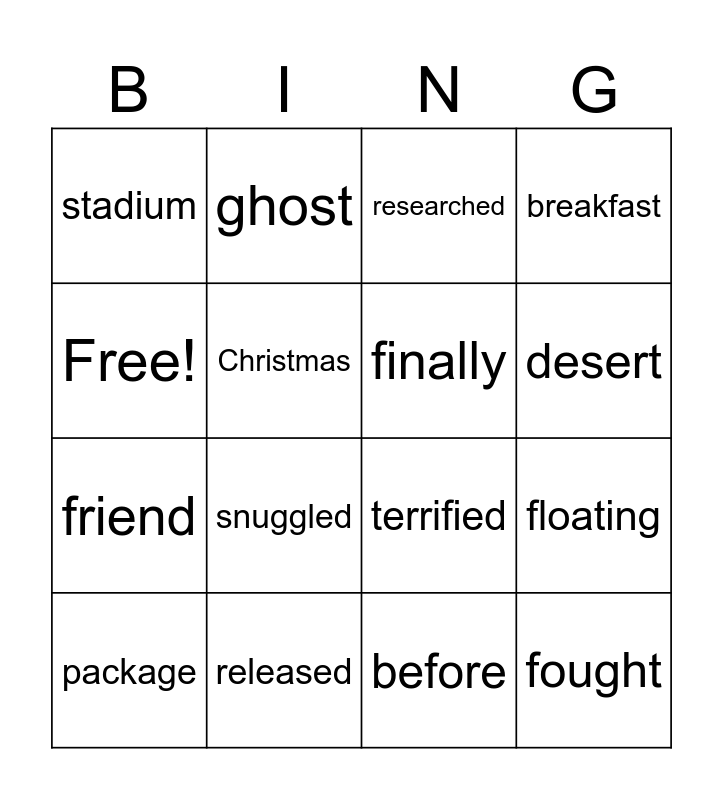 This bingo card has 16 words: released, floating, researched, stadium, friend, ghost, terrified, before, Free!, Christmas, package, breakfast, snuggled, desert, finally and fought.