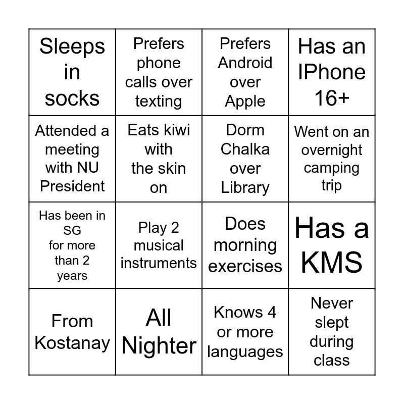 This bingo card has 16 words: All Nighter, Has a KMS, Prefers Android over Apple, Sleeps in socks, Has been in SG for more than 2 years, Prefers phone calls over texting, Does morning exercises, Knows 4 or more languages, Attended a meeting with NU President, Eats kiwi with the skin on, From Kostanay, Has an IPhone 16+, Play 2 musical instruments, Went on an overnight camping trip, Dorm Chalka over Library and Never slept during class.
