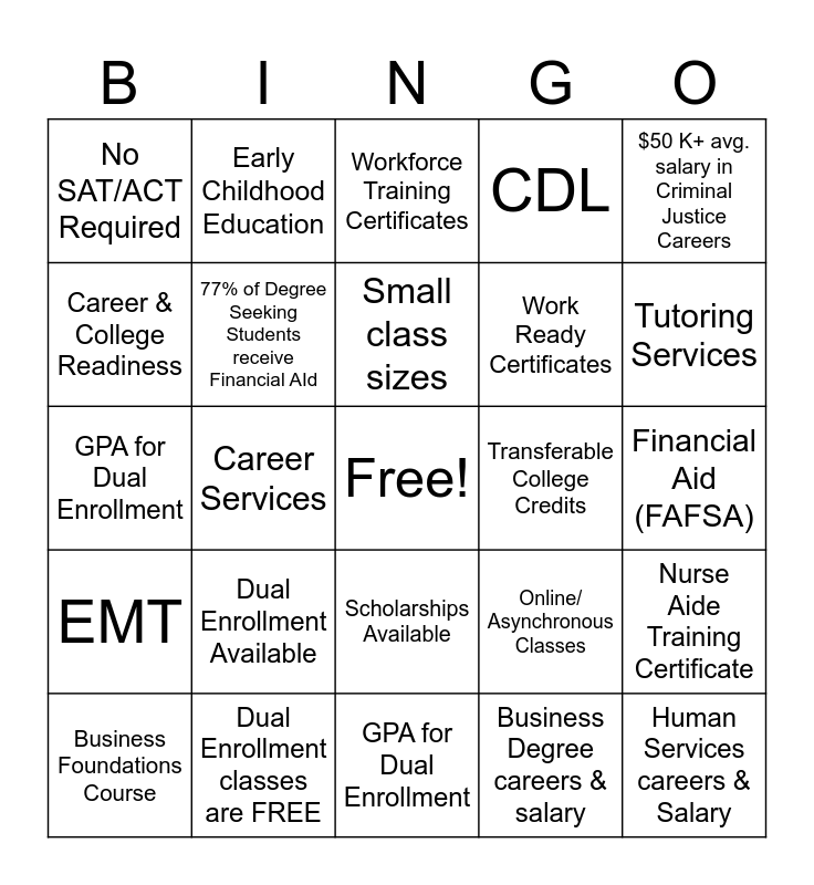 This bingo card has a free space and 24 words: Dual Enrollment Available, Dual Enrollment classes are FREE, Small class sizes, Business Foundations Course, $50 K+ avg. salary in Criminal Justice Careers, No SAT/ACT Required, Career & College Readiness, Early Childhood Education, Transferable College Credits, Scholarships Available, Work Ready Certificates, GPA for Dual Enrollment, Online/ Asynchronous Classes, Nurse Aide Training Certificate, 77% of Degree Seeking Students receive Financial AId, Business Degree careers & salary, Financial Aid (FAFSA), Workforce Training Certificates, Tutoring Services, Career Services, Human Services careers & Salary, EMT, CDL and GPA for Dual Enrollment.