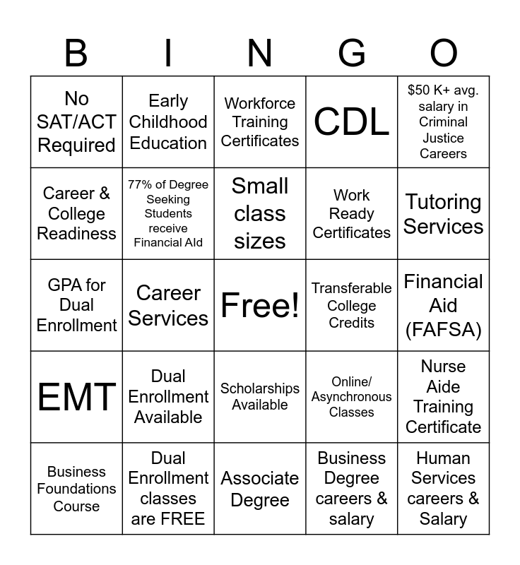 This bingo card has a free space and 24 words: Dual Enrollment Available, Dual Enrollment classes are FREE, Small class sizes, Business Foundations Course, $50 K+ avg. salary in Criminal Justice Careers, No SAT/ACT Required, Career & College Readiness, Early Childhood Education, Transferable College Credits, Scholarships Available, Work Ready Certificates, GPA for Dual Enrollment, Online/ Asynchronous Classes, Nurse Aide Training Certificate, 77% of Degree Seeking Students receive Financial AId, Business Degree careers & salary, Financial Aid (FAFSA), Workforce Training Certificates, Tutoring Services, Career Services, Human Services careers & Salary, EMT, CDL and Associate Degree.