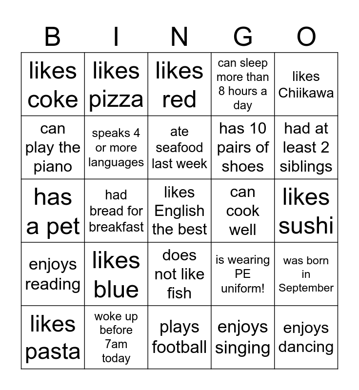 This bingo card has 25 words: likes blue, plays football, ate seafood last week, likes pasta, likes Chiikawa, likes coke, can play the piano, likes pizza, can cook well, does not like fish, has 10 pairs of shoes, has a pet, is wearing PE uniform!, was born in September, speaks 4 or more languages, enjoys dancing, likes sushi, likes red, had at least 2 siblings, had bread for breakfast, likes English the best, woke up before 7am today, enjoys reading, can sleep more than 8 hours a day and enjoys singing.
