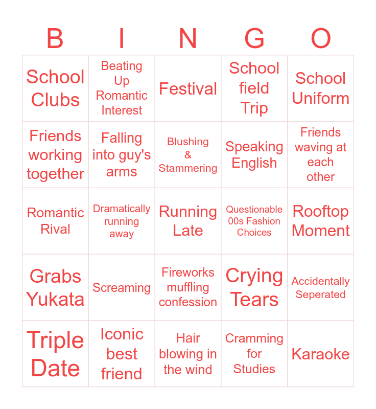 This bingo card has a free space and 24 words: Triple Date, Screaming, Blushing & Stammering, Cramming for Studies, School Uniform, School Clubs, Beating Up Romantic Interest, Festival, Questionable 00s Fashion Choices, Rooftop Moment, Romantic Rival, Falling into guy's arms, Crying Tears, Accidentally Seperated, Friends working together, Iconic best friend, Hair blowing in the wind, School field Trip, Friends waving at each other, Grabs Yukata, Dramatically running away, Fireworks muffling confession, Speaking English and Karaoke.