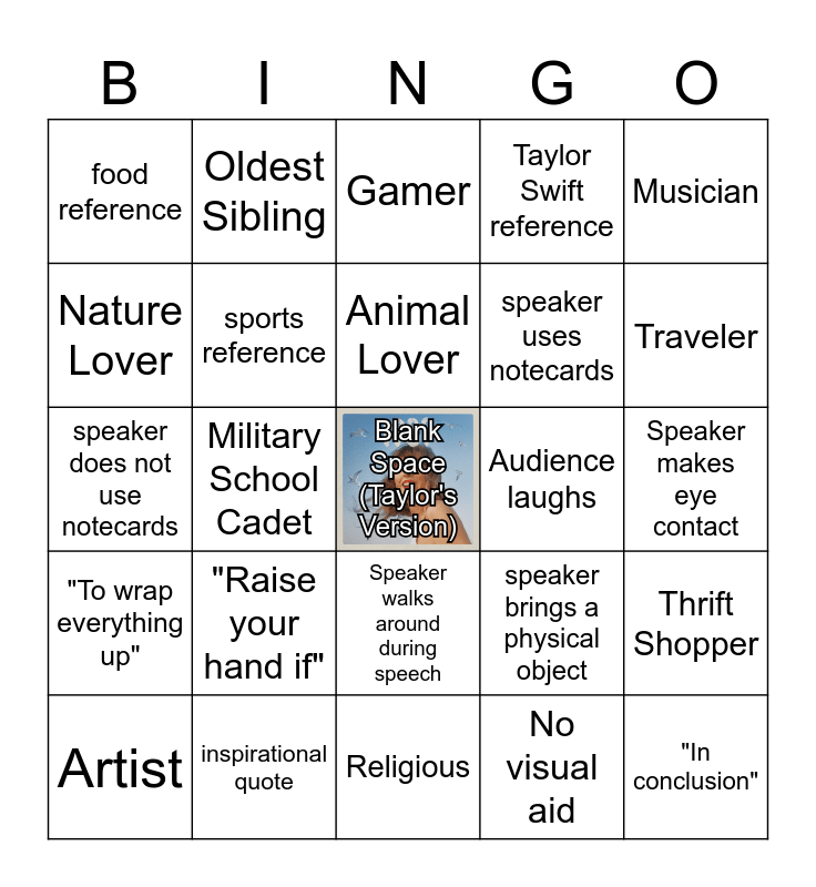 This bingo card has a free space and 24 words: "Raise your hand if", inspirational quote, Animal Lover, Artist, Musician, food reference, Nature Lover, Oldest Sibling, Audience laughs, Speaker walks around during speech, speaker uses notecards, speaker does not use notecards, speaker brings a physical object, Thrift Shopper, sports reference, No visual aid, Speaker makes eye contact, Gamer, Traveler, Military School Cadet, "In conclusion", "To wrap everything up", Taylor Swift reference and Religious.