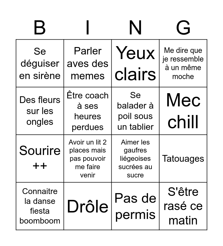 This bingo card has 16 words: Drôle, Tatouages, Yeux clairs, Se déguiser en sirène, Sourire ++, Parler aves des memes, Aimer les gaufres liégeoises sucrées au sucre, Pas de permis, Des fleurs sur les ongles, Être coach à ses heures perdues, Connaitre la danse fiesta boomboom, Me dire que je ressemble à un même moche, Avoir un lit 2 places mais pas pouvoir me faire venir, Mec chill, Se balader à poil sous un tablier and S'être rasé ce matin.