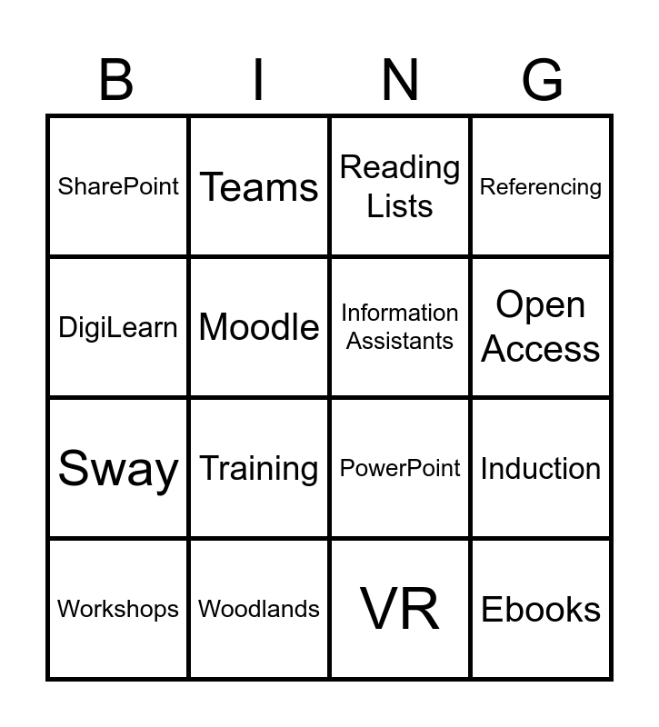 This bingo card has 26 words: Free!, Learning Technologies, Open Access, Libraries, DigiLearn, SharePoint, Moodle, Teams, VR, Canva, Sway, PowerPoint, Excel, MS Forms, Induction, Drop-in, Referencing, Ebooks, Reading Lists, Workshops, Training, Blossomfield, Woodlands, Stratford, Information Assistants and Subject Librarian.