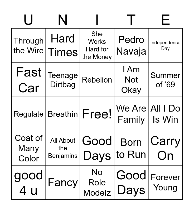 This bingo card has a free space and 80 words: It’s a Hard Knock Life, Livin’ on a Prayer, She Works Hard for the Money, (Working At The) Car Wash, Bills, Bills, Bills, I Need a Dollar, What Would You Do?, 9 to 5, Coat of Many Colors, Fancy Like, Workin’ for a Livin’, Takin’ Care of Business, Pedro Navaja, Through the Wire, Changes, Fast Car, 679, All About the Benjamins, Price Tag, All I Do Is Win, If I Had A Million Dollars, Independence Day, Regulate, Rebelion, Teenage Dirtbag, Kids, Young, Wild & Free, School’s Out, ABC, My Front Porch Looking In, Summer of ’69, Girls Just Want to Have Fun, No Role Modelz, Dammit, good 4 u, We Are Family, September, Mi Gente, Isn’t She Lovely, Forever Young, There Goes My Future, Mama Said, Younger, Papa Was a Rollin’ Stone, Daughters, Hard Times, Anxiety, I Want to Get Better, Titanium, High Hopes, Carry On, Breathin, Born to Run, Go Your Own Way, Waterfalls, Born This Way, Dancing On My Own, Semi-Charmed Life, The Story, Good Days, I Am Not Okay, Unwell, Ain’t No Stoppin’ Us Now, Juice, Teenage Dirtbag, Car Wash, Ain’t No Stoppin’ Us Now, Septem, What Would You Do? By City High, The Message, Coat of Many Color, Fancy, Born This Way, Dancing On My Own, Semi-Charmed Life, The Story, Good Days, I Am Not Okay, Unwell and Fancy Like.
