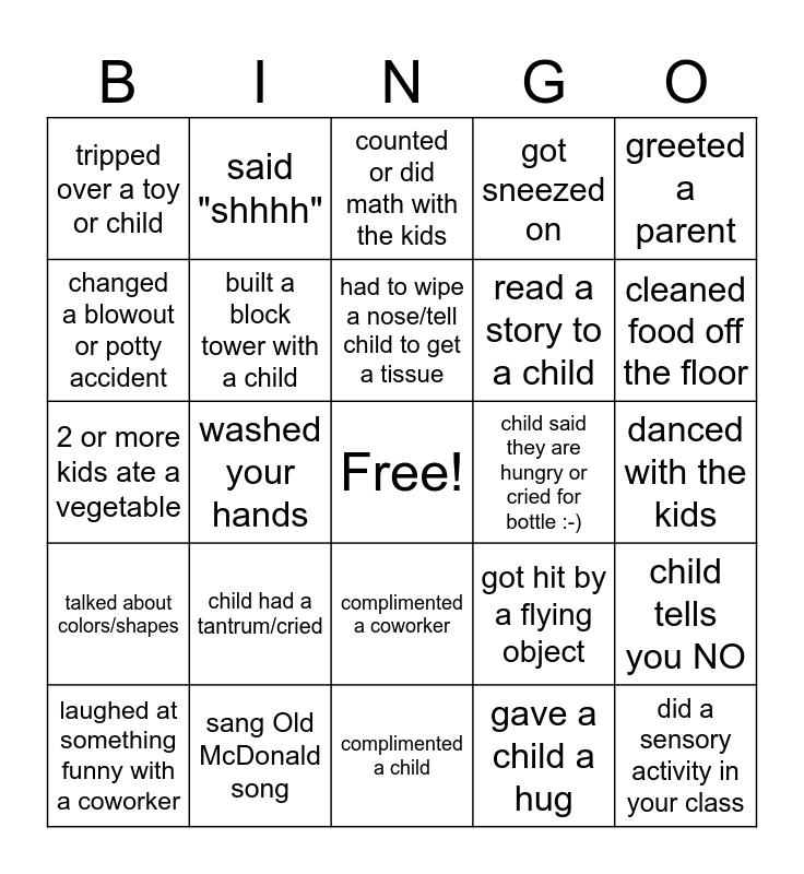 This bingo card has a free space and 24 words: child had a tantrum/cried, sang Old McDonald song, had to wipe a nose/tell child to get a tissue, laughed at something funny with a coworker, greeted a parent, tripped over a toy or child, changed a blowout or potty accident, said "shhhh", child said they are hungry or cried for bottle :-), complimented a coworker, read a story to a child, 2 or more kids ate a vegetable, got hit by a flying object, child tells you NO, built a block tower with a child, gave a child a hug, danced with the kids, counted or did math with the kids, cleaned food off the floor, washed your hands, did a sensory activity in your class, talked about colors/shapes, got sneezed on and complimented a child.