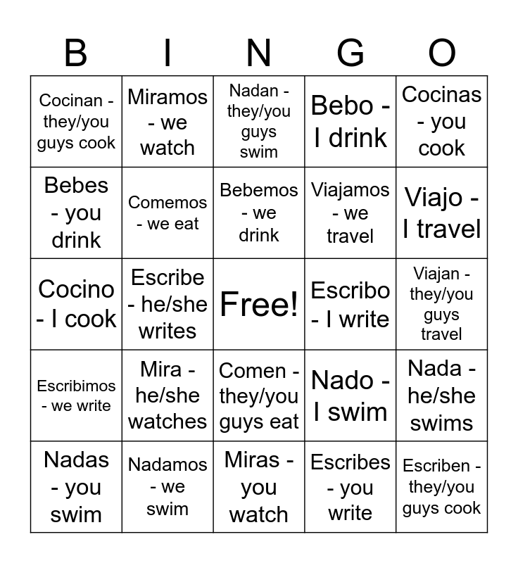 This bingo card has a free space and 35 words: Como - I eat, Comes - you eat, Come - he/she eats, Comemos - we eat, Comen - they/you guys eat, Bebo - I drink, Bebes - you drink, Bebe - he/she drinks, Bebemos - we drink, Beben - they/you guys drink, Cocino - I cook, Cocinas - you cook, Cocina - he/she cooks, Cocinamos - we cook, Cocinan - they/you guys cook, Escribo - I write, Escribes - you write, Escribe - he/she writes, Escribimos - we write, Escriben - they/you guys cook, Nado - I swim, Nadas - you swim, Nada - he/she swims, Nadamos - we swim, Nadan - they/you guys swim, Viajo - I travel, Viajas - you travel, Viaja - he/she travels, Viajamos - we travel, Viajan - they/you guys travel, Miro - I watch, Miras -you watch, Mira - he/she watches, Miramos - we watch and Miran - they/you guys watch.