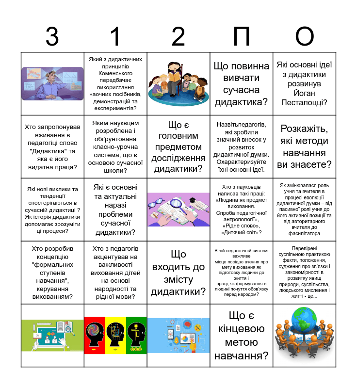 This bingo card has 6 images, a free space and 18 words: Хто з педагогів акцентував на важливості виховання дітей на основі народності та рідної мови?, Що є головним предметом дослідження дидактики?, Які основні ідеї з дидактики розвинув Йоган Песталоцці?, Хто запропонував вживання в педагогіці слово "Дидактика" та яка є його видатна праця?, Який з дидактичних принципів Коменського передбачає використання наочних посібників, демонстрацій та експериментів?, Хто з науковців написав такі праці: «Людина як предмет виховання. Спроба педагогічної антропології», «Рідне слово», «Дитячий світ»?, Що входить до змісту дидактики?, Назвітьпедагогів, які зробили значний внесок у розвиток дидактичної думки. Охарактеризуйте їхні основні ідеї., Які нові виклики та тенденції спостерігаються в сучасній дидактиці ? Як історія дидактики допомагає зрозуміти ці процеси?, В чій педагогічній системі важливе місце посідає вчення про мету виховання як підготовку людини до життя і праці, як формування в людині почуття обов’язку перед народом?, Перевірені суспільною практикою факти, положення, судження про зв’язки і закономірності в розвитку явищ природи, суспільства, людського мислення і житті - це..., Яким науквцем розроблена і обґрунтована класно-урочна система, що є основою сучасної школи?, Що є кінцевою метою навчання?, Як змінювалася роль учня та вчителя в процесі еволюції дидактичної думки – від пасивної ролі учня до його активної позиції та від авторитарного вчителя до фасилітатора, Розкажіть, які методи навчання ви знаєете?, Які є основні та актуальні наразі проблеми сучасної дидактики?, Хто розробив концепцію "формальних ступенів навчання", керування вихованням? and Що повинна вивчати сучасна дидактика?.