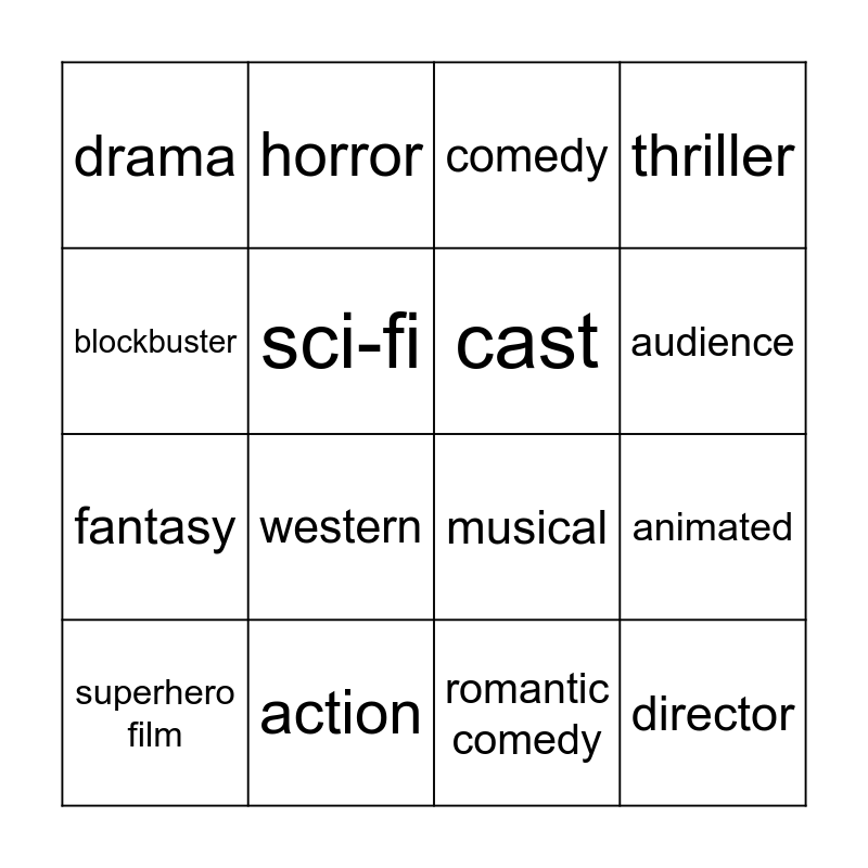 This bingo card has 16 words: action, animated, comedy, drama, fantasy, horror, musical, romantic comedy, blockbuster, sci-fi, superhero film, thriller, western, audience, cast and director.