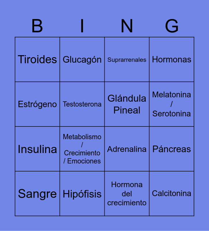This bingo card has 16 words: Hipófisis, Páncreas, Suprarrenales, Tiroides, Insulina, Glucagón, Adrenalina, Hormona del crecimiento, Estrógeno, Testosterona, Sangre, Hormonas, Metabolismo / Crecimiento / Emociones, Melatonina / Serotonina, Glándula Pineal and Calcitonina.
