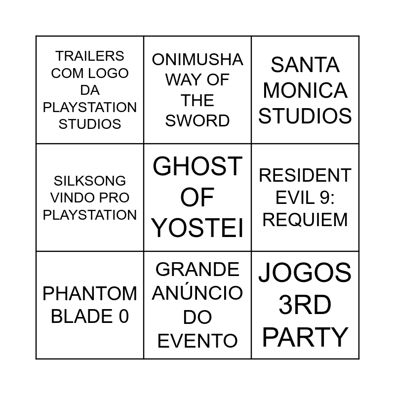 This bingo card has a free space and 8 words: RESIDENT EVIL 9: REQUIEM, SANTA MONICA STUDIOS, ONIMUSHA WAY OF THE SWORD, PHANTOM BLADE 0, TRAILERS COM LOGO DA PLAYSTATION STUDIOS, JOGOS 3RD PARTY, SILKSONG VINDO PRO PLAYSTATION and GRANDE ANÚNCIO DO EVENTO.