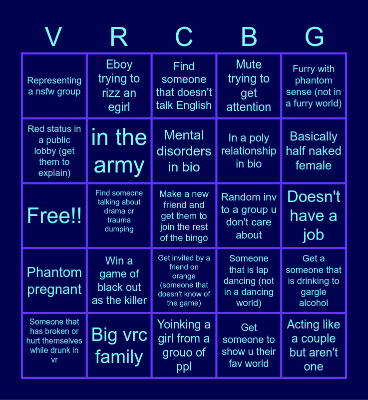 This bingo card has a free space and 24 words: Someone that has broken or hurt themselves while drunk in vr, Win a game of black out as the killer, Mental disorders in bio, Get someone to show u their fav world, Furry with phantom sense (not in a furry world), Representing a nsfw group, Eboy trying to rizz an egirl, Find someone that doesn't talk English, Random inv to a group u don't care about, Doesn't have a job, Free!!, in the army, Someone that is lap dancing (not in a dancing world), Get a someone that is drinking to gargle alcohol, Red status in a public lobby (get them to explain), Big vrc family, Yoinking a girl from a grouo of ppl, Mute trying to get attention, Basically half naked female, Phantom pregnant, Find someone talking about drama or trauma dumping, Get invited by a friend on orange (someone that doesn't know of the game), In a poly relationship in bio and Acting like a couple but aren't one.