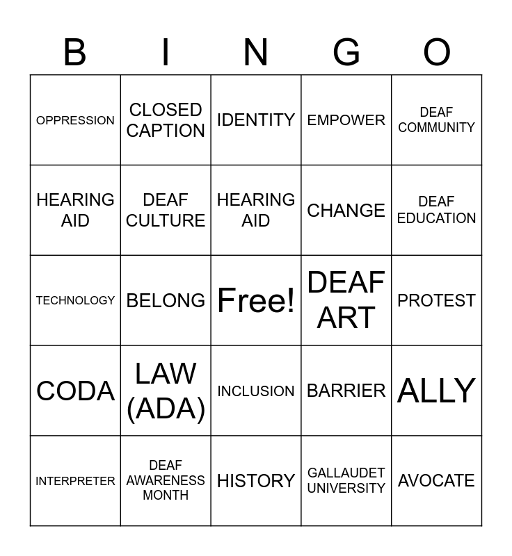 This bingo card has a free space and 34 words: DEAF PRESIDENT NOW, GALLAUDET UNIVERSITY, AMERICAN SCHOOL FOR THE DEAF, CLERC, CODA, DEAF CULTURE, DEAF COMMUNITY, INTERPRETER, CLOSED CAPTION, COCHLEAR IMPLANT, HEARING AID, IDENTITY, EQUAL, HUMAN RIGHTS, DEAF ART, DEAF EDUCATION, DEAF AWARENESS MONTH, TECHNOLOGY, LAW (ADA), BARRIER, INCLUSION, ACCESS, OPPRESSION, PROTEST, HISTORY, AVOCATE, EMPOWER, LEADERSHIP, CHANGE, HEARING AID, RESPECT, BELONG, ALLY and SUPPORT.