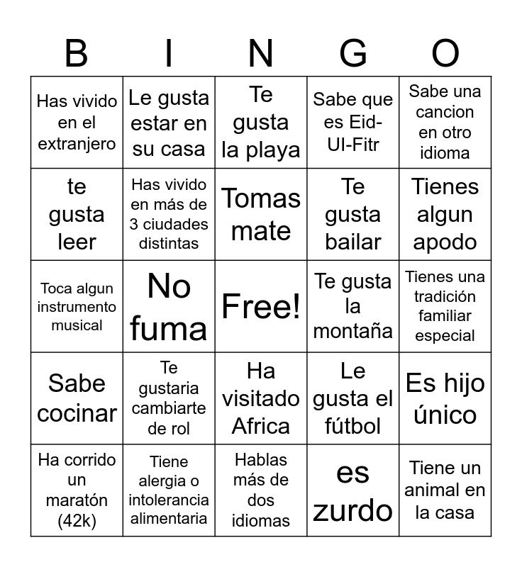 This bingo card has a free space and 29 words: Eres soltero (a), Tiene alergia o intolerancia alimentaria, Te gusta la playa, Se ha quebrado huesos, Sabe una cancion en otro idioma, Has vivido en el extranjero, Has vivido en más de 3 ciudades distintas, Tomas mate, Te gusta la montaña, Es hijo único, Ha corrido un maratón (42k), No fuma, es zurdo, Tiene un animal en la casa, Toca algun instrumento musical, Eres vegetariano o vegano, Hablas más de dos idiomas, Le gusta el fútbol, Tienes algun apodo, Sabe cocinar, Te gustaria cambiarte de rol, Vas al gym, Te gusta bailar, Tienes una tradición familiar especial, te gusta leer, Le gusta estar en su casa, Ha visitado Africa, Sabe que es Eid-UI-Fitr and Ha lidiado con una enfermedad grave.