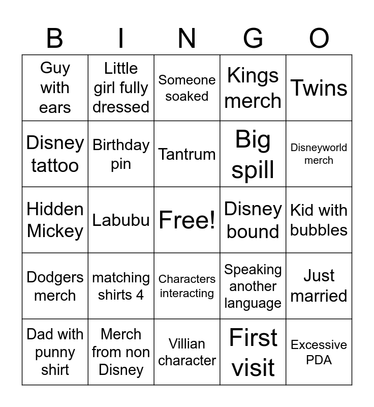 This bingo card has a free space and 24 words: matching shirts 4, Merch from non Disney, Tantrum, Dad with punny shirt, Twins, Guy with ears, Disney tattoo, Little girl fully dressed, Disney bound, Characters interacting, Big spill, Hidden Mickey, Speaking another language, Just married, Birthday pin, First visit, Kid with bubbles, Someone soaked, Disneyworld merch, Labubu, Excessive PDA, Dodgers merch, Kings merch and Villian character.