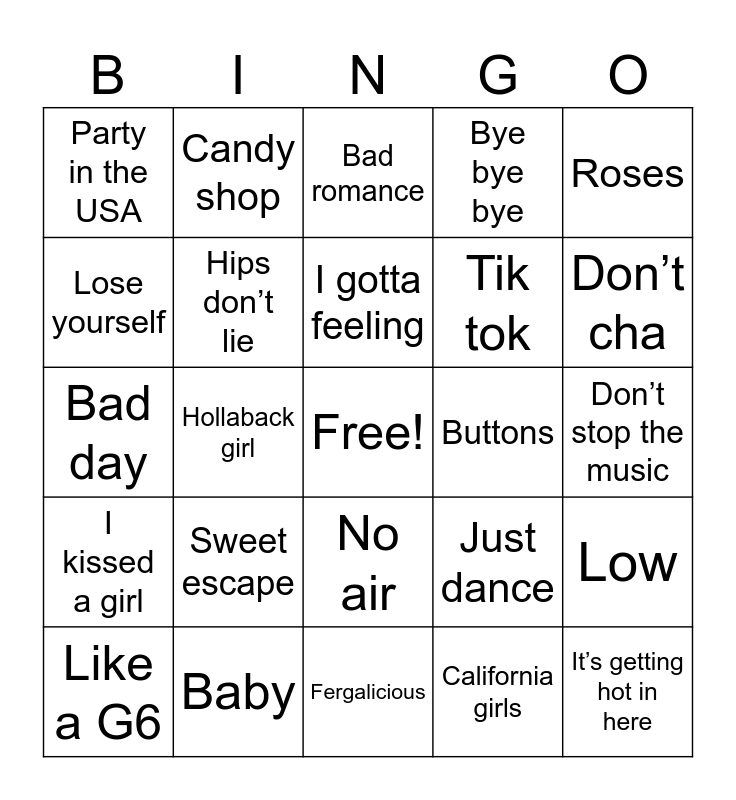This bingo card has a free space and 44 words: Beautiful girl, It’s getting hot in here, Oops I did it again, Like a G6, Magic, California girls, Bad romance, Senorita, Roses, Baby, Bye bye bye, Buttons, No air, Sweet escape, Jenny from the block, Fergalicious, Temperature, Bad day, Empire State of mind, Don’t cha, Candy shop, Complicated, So what, Party in the USA, Boom boom pow, Don’t stop the music, It wasn’t me, Because of you, Just dance, I kissed a girl, Halo, Low, Sexyback, Big girls don’t cry, Hollaback girl, Crazy in love, Apologize, Bleeding love, I gotta feeling, Lose yourself, Tik tok, Umbrella, Hips don’t lie and Poker face.