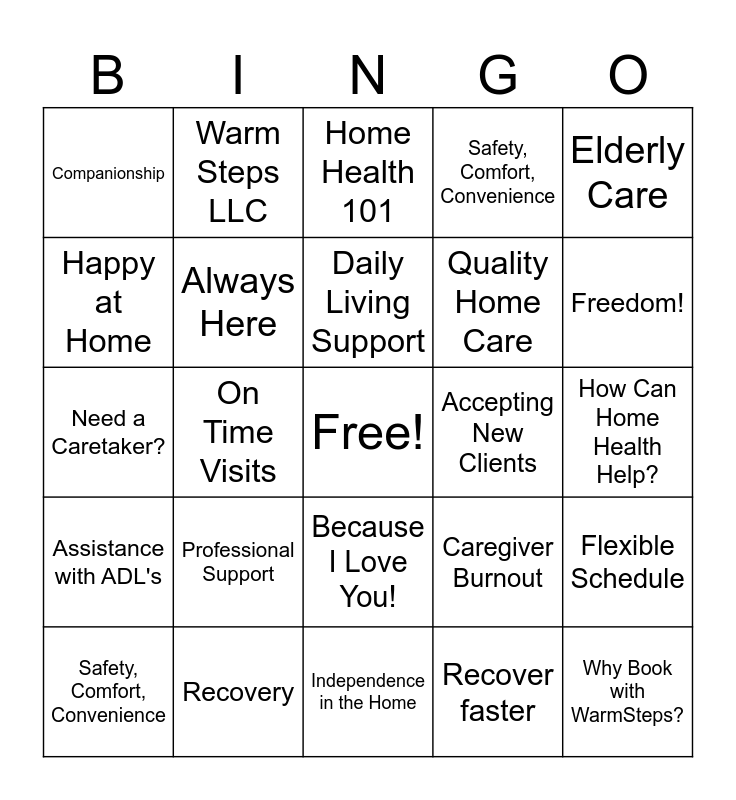 This bingo card has a free space and 25 words: Professional Support, Independence in the Home, Daily Living Support, Safety, Comfort, Convenience, Elderly Care, Companionship, Happy at Home, Warm Steps LLC, Accepting New Clients, Because I Love You!, Quality Home Care, Need a Caretaker?, Caregiver Burnout, Flexible Schedule, Always Here, Specialized Care Services, How Can Home Health Help?, Home Health 101, Freedom!, On Time Visits, Why Book with WarmSteps?, Recovery, Assistance with ADL's, Safety, Comfort, Convenience and Recover faster.
