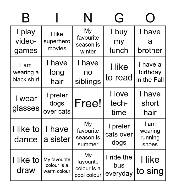 This bingo card has a free space and 24 words: I have a sister, My favourite colour is a warm colour, I have no siblings, I like to draw, I have a brother, I play video-games, I am wearing a black shirt, I like superhero movies, I love tech-time, My favourite season is summer, I like to read, I wear glasses, I prefer cats over dogs, I am wearing running shoes, I have long hair, I ride the bus everyday, I have short hair, My favourite season is winter, I have a birthday in the Fall, I prefer dogs over cats, I like to sing, I like to dance, I buy my lunch and My favourite colour is a cool colour.