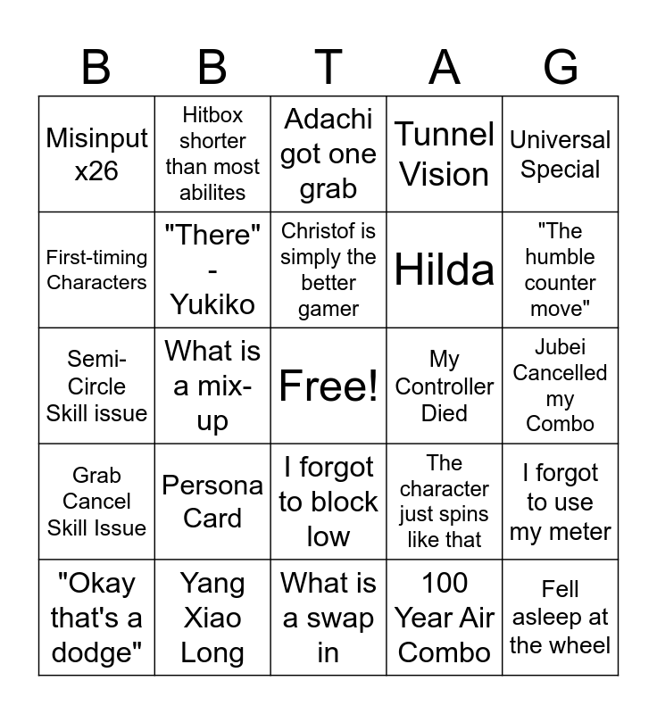 This bingo card has a free space and 24 words: Persona Card, Yang Xiao Long, Christof is simply the better gamer, "Okay that's a dodge", Universal Special, Misinput x26, First-timing Characters, Hitbox shorter than most abilites, My Controller Died, I forgot to block low, Hilda, Semi- Circle Skill issue, The character just spins like that, I forgot to use my meter, "There" - Yukiko, 100 Year Air Combo, Jubei Cancelled my Combo, Adachi got one grab, "The humble counter move", What is a mix-up, Fell asleep at the wheel, Grab Cancel Skill Issue, Tunnel Vision and What is a swap in.