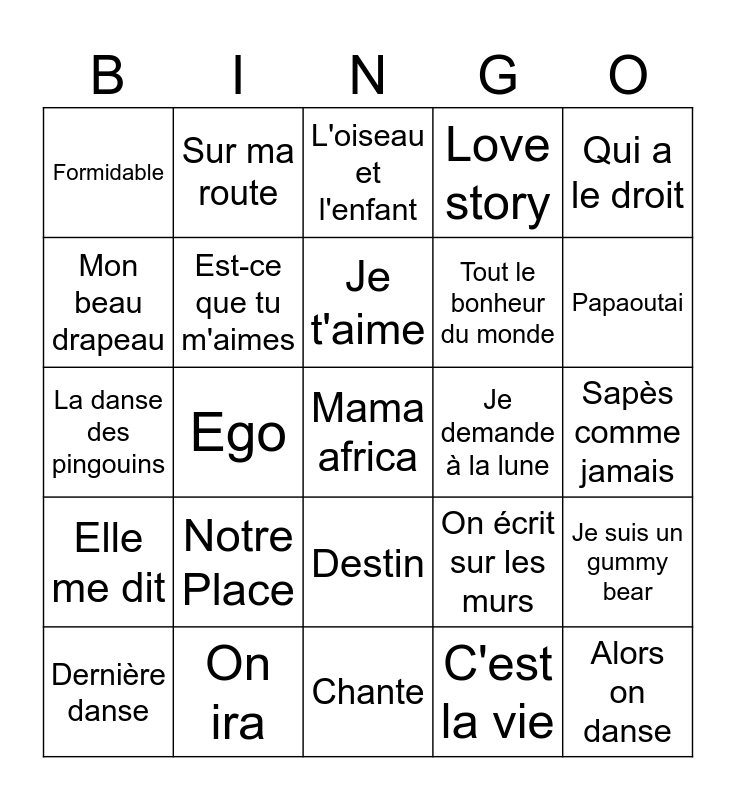 This bingo card has 25 words: Notre Place, Chante, Je t'aime, Dernière danse, Qui a le droit, Formidable, Mon beau drapeau, Sur ma route, Je demande à la lune, Destin, Tout le bonheur du monde, La danse des pingouins, On écrit sur les murs, Je suis un gummy bear, Est-ce que tu m'aimes, Alors on danse, Sapès comme jamais, L'oiseau et l'enfant, Papaoutai, Ego, Mama africa, On ira, Elle me dit, Love story and C'est la vie.