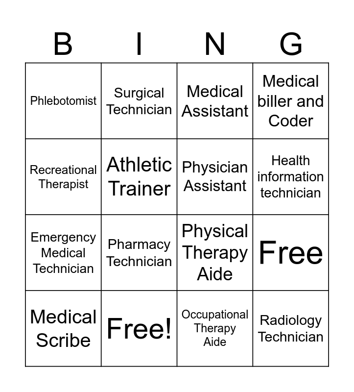 This bingo card has 16 words: Free!, Free, Medical Assistant, Phlebotomist, Emergency Medical Technician, Surgical Technician, Physical Therapy Aide, Occupational Therapy Aide, Recreational Therapist, Athletic Trainer, Medical Scribe, Medical biller and Coder, Pharmacy Technician, Health information technician, Physician Assistant and Radiology Technician.