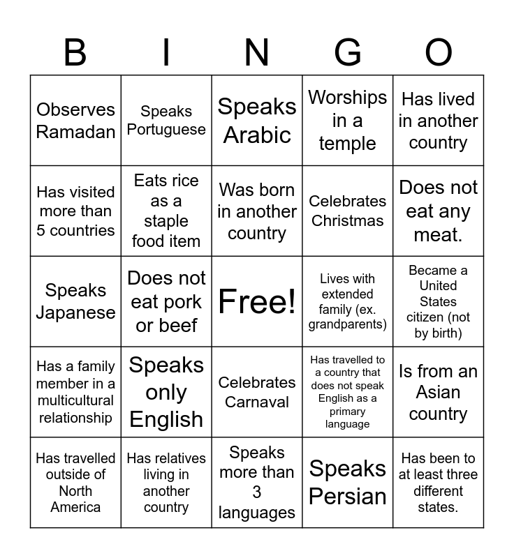This bingo card has a free space and 24 words: Speaks only English, Has relatives living in another country, Was born in another country, Has travelled outside of North America, Has lived in another country, Observes Ramadan, Has visited more than 5 countries, Speaks Portuguese, Lives with extended family (ex. grandparents), Celebrates Carnaval, Celebrates Christmas, Speaks Japanese, Has travelled to a country that does not speak English as a primary language, Is from an Asian country, Eats rice as a staple food item, Speaks Persian, Became a United States citizen (not by birth), Speaks Arabic, Does not eat any meat., Does not eat pork or beef, Has been to at least three different states., Has a family member in a multicultural relationship, Worships in a temple and Speaks more than 3 languages.