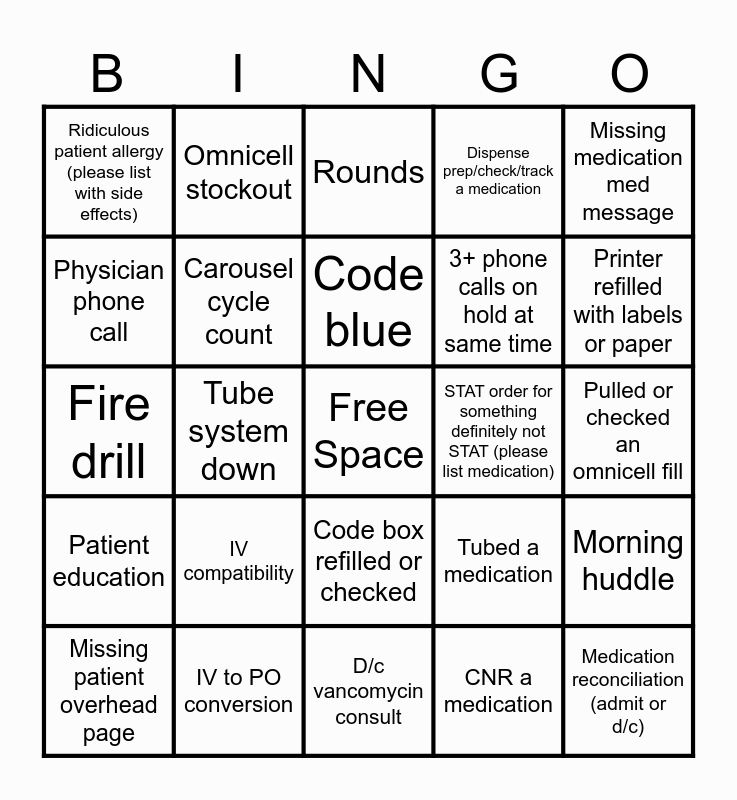 This bingo card has a free space and 24 words: IV compatibility, IV to PO conversion, Code blue, Missing patient overhead page, Missing medication med message, Ridiculous patient allergy (please list with side effects), Physician phone call, Omnicell stockout, STAT order for something definitely not STAT (please list medication), Code box refilled or checked, 3+ phone calls on hold at same time, Fire drill, Tubed a medication, Morning huddle, Carousel cycle count, CNR a medication, Pulled or checked an omnicell fill, Rounds, Printer refilled with labels or paper, Tube system down, Medication reconciliation (admit or d/c), Patient education, Dispense prep/check/track a medication and D/c vancomycin consult.