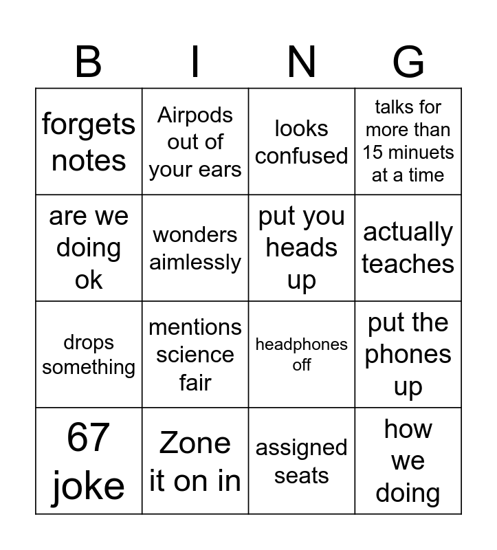 This bingo card has 16 words: Zone it on in, put the phones up, looks confused, forgets notes, drops something, Airpods out of your ears, headphones off, assigned seats, are we doing ok, wonders aimlessly, 67 joke, talks for more than 15 minuets at a time, mentions science fair, actually teaches, put you heads up and how we doing.