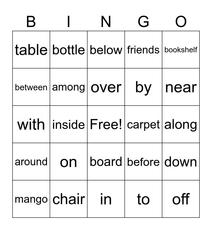This bingo card has a free space and 24 words: on, chair, over, mango, bookshelf, table, between, bottle, carpet, board, by, with, before, down, among, to, along, below, near, inside, off, around, friends and in.