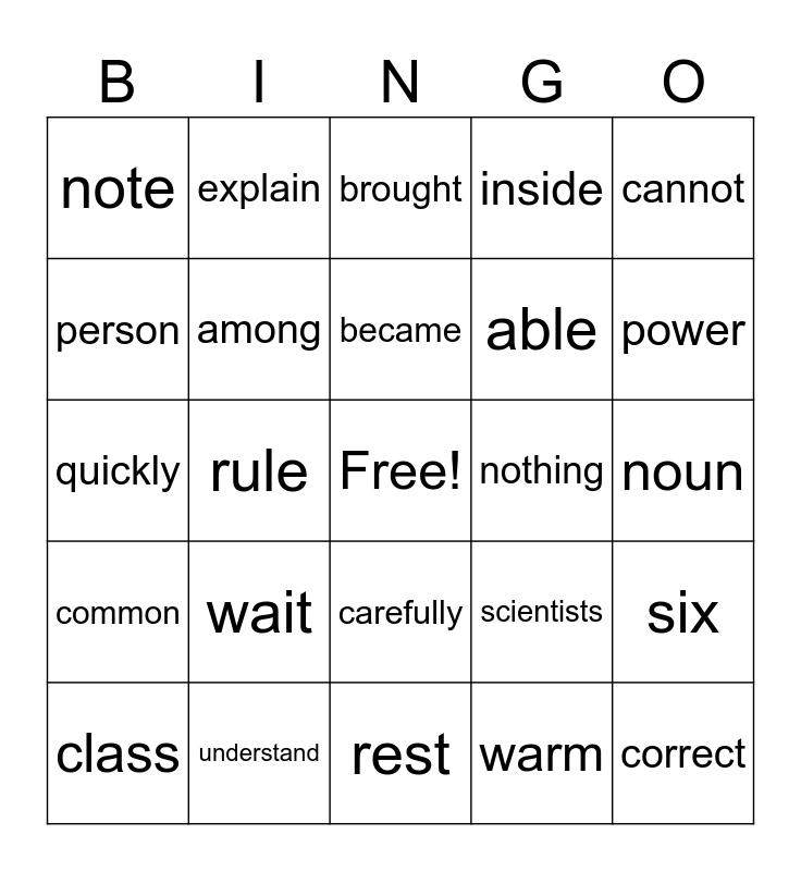 This bingo card has a free space and 29 words: class, force, rule, finally, note, brought, among, wait, nothing, understand, noun, correct, rest, warm, power, oh, carefully, common, cannot, quickly, scientists, bring, able, person, inside, explain, six, became and wheels.