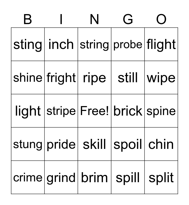 This bingo card has a free space and 24 words: pride, grind, ripe, crime, flight, sting, shine, inch, brick, skill, still, light, spoil, chin, fright, spill, spine, string, wipe, stripe, split, stung, probe and brim.
