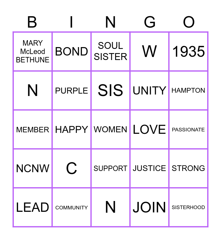 This bingo card has 1 images and 29 words: LEAD, ADVOCATE, SIS, EMPOWER, 1935, MARY McLeod BETHUNE, BOND, SUPPORT, LOVE, SISTERHOOD, NCNW, PURPLE, JOIN, STRONG, INDUCTION, HAPPY, WOMEN, JUSTICE, HAMPTON, MEMBER, COMMUNITY, SOUL SISTER, UNITY, PASSIONATE, N, C, N, W and NCWN 1935.