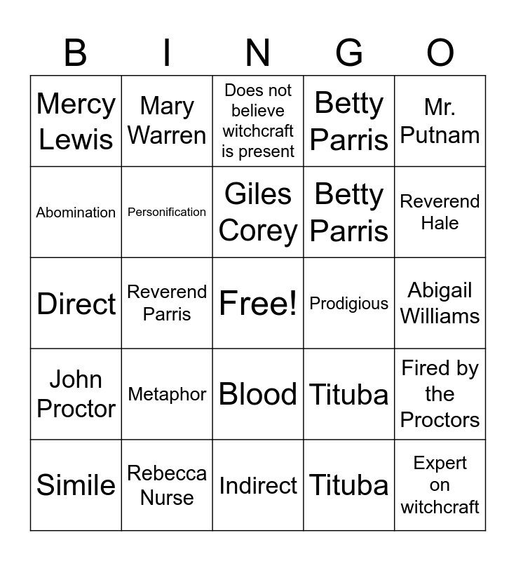 This bingo card has a free space and 24 words: Metaphor, Rebecca Nurse, Giles Corey, Simile, Mr. Putnam, Mercy Lewis, Abomination, Mary Warren, Prodigious, Blood, Betty Parris, Direct, Tituba, Fired by the Proctors, Personification, Tituba, Abigail Williams, Does not believe witchcraft is present, Reverend Hale, Reverend Parris, Expert on witchcraft, John Proctor, Betty Parris and Indirect.