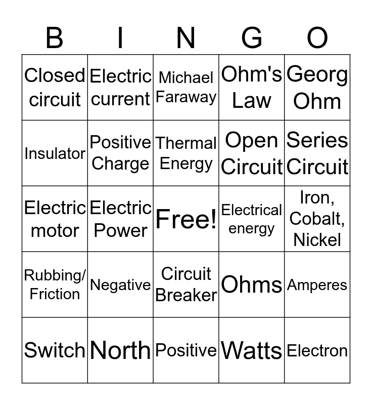 This bingo card has a free space and 48 words: Atoms, Electron, Proton, Positive, Negative, Static electricity, Electric current, Conductor, Insulator, Negative Charge, Positive Charge, Ohm's Law, Amperes, Ohms, Volts, Potential Difference, Thermal Energy, Electrical energy, Mechanical Energy, Georg Ohm, Electric Power, Watts, Closed circuit, Open Circuit, Parallel Circuit, Series Circuit, Switch, Fuse, Circuit Breaker, Rubbing/ Friction, Magnetism, Attraction, Repulsion, Magnetic Poles, North, South, Magnetic South, Iron, Cobalt, Nickel, Permanent Magnet, Temporary Magnet, Electromagnet, Magnetic Induction, Michael Faraway, Generator, Electric motor, Transformer, Alternating Current (AC) and Direct Current (DC).