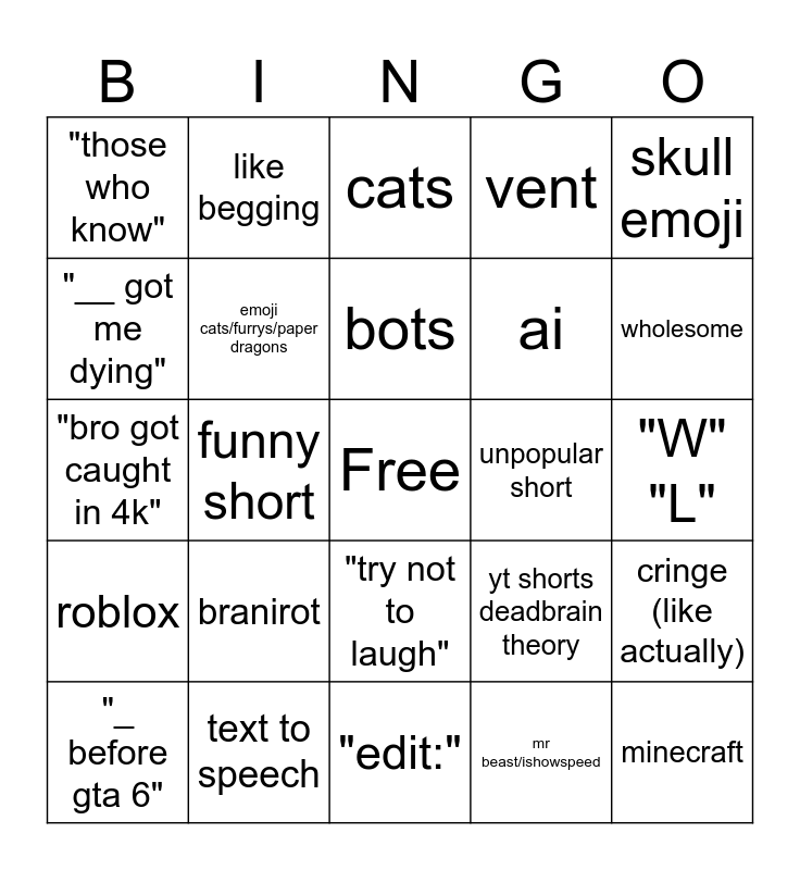 This bingo card has a free space and 24 words: branirot, text to speech, bots, "_ before gta 6", skull emoji, "those who know", "__ got me dying", like begging, unpopular short, "try not to laugh", ai, "bro got caught in 4k", yt shorts deadbrain theory, cringe (like actually), emoji cats/furrys/paper dragons, mr beast/ishowspeed, "W" "L", cats, wholesome, funny short, minecraft, roblox, vent and "edit:".