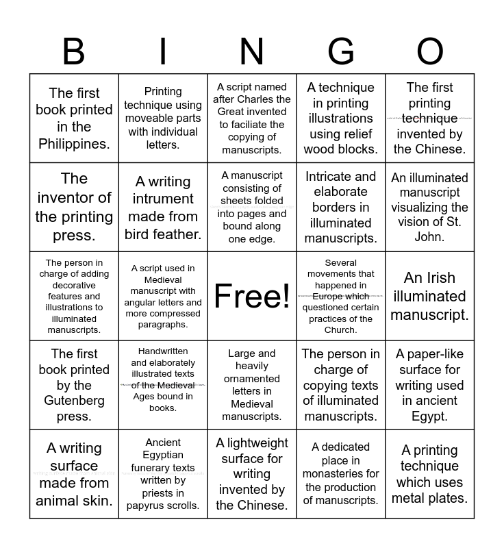 This bingo card has 6 images, a free space and 24 words: Handwritten and elaborately illustrated texts of the Medieval Ages bound in books., Ancient Egyptian funerary texts written by priests in papyrus scrolls., A manuscript consisting of sheets folded into pages and bound along one edge., A writing surface made from animal skin., The first printing technique invented by the Chinese., The first book printed in the Philippines., The inventor of the printing press., Printing technique using moveable parts with individual letters., Several movements that happened in Europe which questioned certain practices of the Church., Large and heavily ornamented letters in Medieval manuscripts., Intricate and elaborate borders in illuminated manuscripts., The person in charge of adding decorative features and illustrations to illuminated manuscripts., The person in charge of copying texts of illuminated manuscripts., A paper-like surface for writing used in ancient Egypt., A writing intrument made from bird feather., A dedicated place in monasteries for the production of manuscripts., An Irish illuminated manuscript., A script named after Charles the Great invented to faciliate the copying of manuscripts., An illuminated manuscript visualizing the vision of St. John., A script used in Medieval manuscript with angular letters and more compressed paragraphs., A printing technique which uses metal plates., The first book printed by the Gutenberg press., A technique in printing illustrations using relief wood blocks. and A lightweight surface for writing invented by the Chinese..