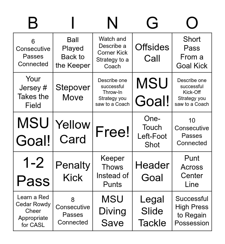This bingo card has a free space and 27 words: Header Goal, Nutmeg, MSU Goal!, MSU Diving Save, Your Jersey # Takes the Field, Watch and Describe a Corner Kick Strategy to a Coach, Ball Played Back to the Keeper, 1-2 Pass, One-Touch Left-Foot Shot, Punt Across Center Line, MSU Goal!, Offsides Call, Learn a Red Cedar Rowdy Cheer Appropriate for CASL, 8 Consecutive Passes Connected, Describe one successful Kick-Off Strategy you saw to a Coach, Scissors Move, Stepover Move, Describe one successful Throw-In Strategy you saw to a Coach, Penalty Kick, 6 Consecutive Passes Connected, 10 Consecutive Passes Connected, Legal Slide Tackle, Yellow Card, Successful High Press to Regain Possession, Keeper Thows Instead of Punts, Short Pass From a Goal Kick and Flop.