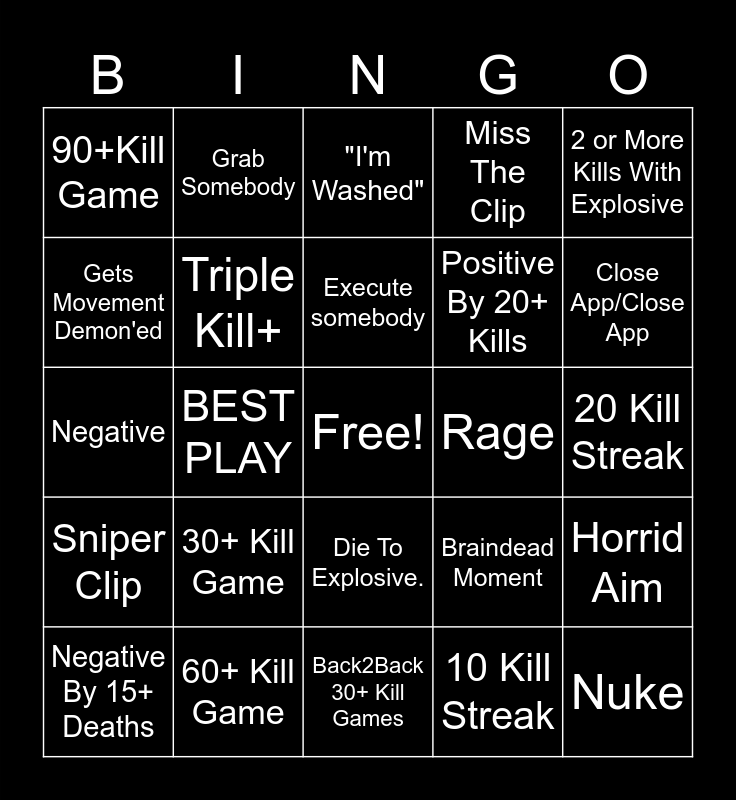 This bingo card has a free space and 24 words: 30+ Kill Game, 60+ Kill Game, Execute somebody, Negative By 15+ Deaths, 2 or More Kills With Explosive, 90+Kill Game, Gets Movement Demon'ed, Grab Somebody, Rage, Die To Explosive., Positive By 20+ Kills, Negative, Braindead Moment, Horrid Aim, Triple Kill+, 10 Kill Streak, 20 Kill Streak, "I'm Washed", Close App/Close App, BEST PLAY, Nuke, Sniper Clip, Miss The Clip and Back2Back 30+ Kill Games.