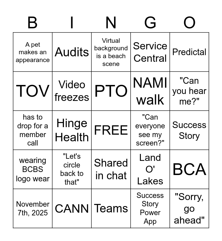 This bingo card has a free space and 29 words: November 7th, 2025, Interpretive Services Issues, Hinge Health, Talking while on mute, A pet makes an appearance, Virtual background is a beach scene, Video freezes, "Let's circle back to that", "Can everyone see my screen?", CANN, Success Story, "Sorry, go ahead", Teams, Success Story Power App, "Can you hear me?", A pet makes an appearance, Shared in chat, wearing BCBS logo wear, Predictal, has to drop for a member call, Land O' Lakes, Talking at the same time, NAMI walk, TOV, Service Central, Audits, BCA, PTO and Transplant Team.