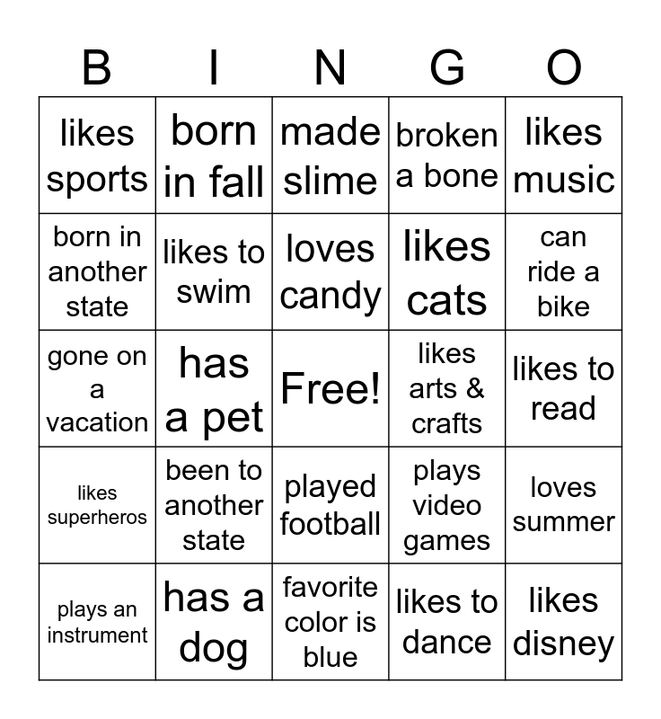 This bingo card has a free space and 29 words: plays an instrument, youngest, has a pet, has a sister, likes sports, made slime, likes to swim, been to another state, likes arts & crafts, has a dog, likes to read, likes disney, favorite color is blue, likes to dance, can ride a bike, likes games, played football, likes superheros, likes music, gone on a vacation, plays video games, likes to sing, likes cats, born in another state, broken a bone, born in fall, loves summer, loves candy and has glasses.