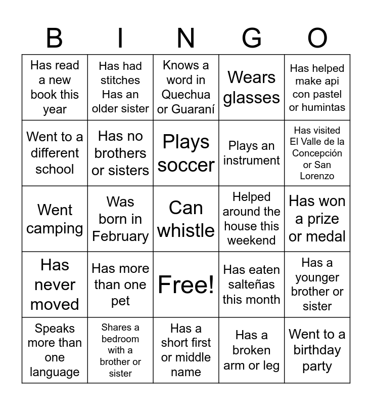 This bingo card has 27 words: Free!, Speaks more than one language, Has no brothers or sisters, Went to another city in Bolivia, Plays an instrument, Has helped make api con pastel or humintas, Has read a new book this year, Has more than one pet, Plays soccer, Has a broken arm or leg, Has won a prize or medal, Went to a different school, Shares a bedroom with a brother or sister, Has a short first or middle name, Helped around the house this weekend, Went to a birthday party, Went camping, Has had stitches Has an older sister, Can whistle, Wears glasses, Has a younger brother or sister, Has never moved, Was born in February, Knows a word in Quechua or Guaraní, Has eaten salteñas this month, Has visited El Valle de la Concepción or San Lorenzo and Has a Bolivian flag in their house.