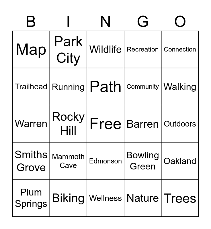 This bingo card has a free space and 24 words: Mammoth Cave, Biking, Path, Plum Springs, Connection, Map, Trailhead, Park City, Barren, Edmonson, Community, Warren, Bowling Green, Oakland, Running, Nature, Outdoors, Wildlife, Walking, Rocky Hill, Trees, Smiths Grove, Recreation and Wellness.